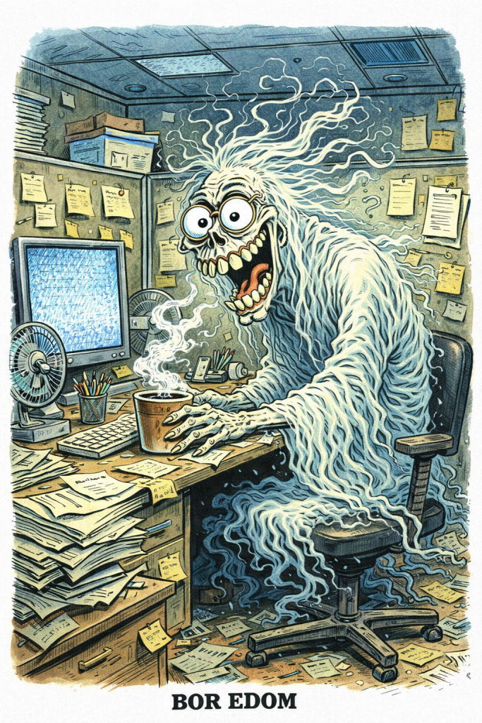 You can feel him when the inbox stays empty too long. The air gets stale. The printer makes a sad cough. Your coffee goes cold faster than it should. Somewhere, a chair creaks even though no one sat down. That is Bor Edom, checking on you.